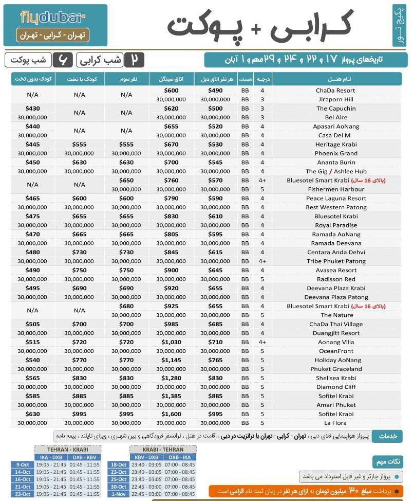 کرابی + پوکت ( 2 شب کرابی + 6 شب پوکت ) ، ویژه تاریخ های 17، 22،24،29 مهر